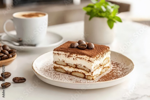 A slice of decadent tiramisu sits on a plate, perfect with coffee.