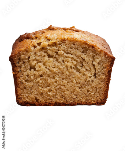A slice of freshly baked banana bread, with a crispy top, placed on a white plate. Transparent background