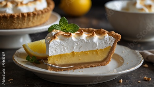 a slice of lemon meringue pie on a white ceramic plate