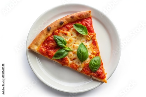 a slice of margarita pizza with tomatoes, mozzarella, basil isolated, top view