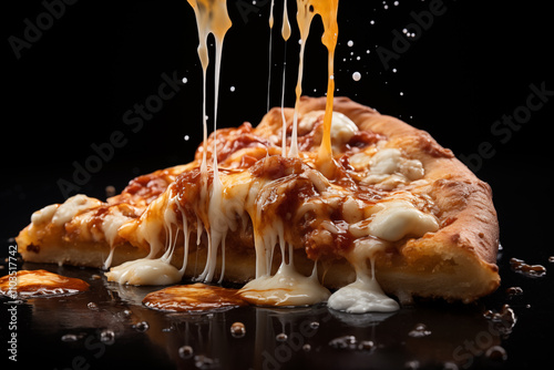 A slice of pizza with cheese dripping, on a black background, with white letters