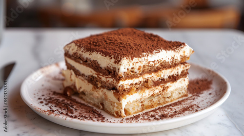 A slice of rich Tiramisu with layers of coffee-soaked ladyfingers, mascarpone cheese, and cocoa powder, served on a white plate
