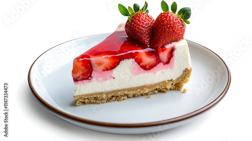 A slice of strawberry cheesecake with strawberries on top