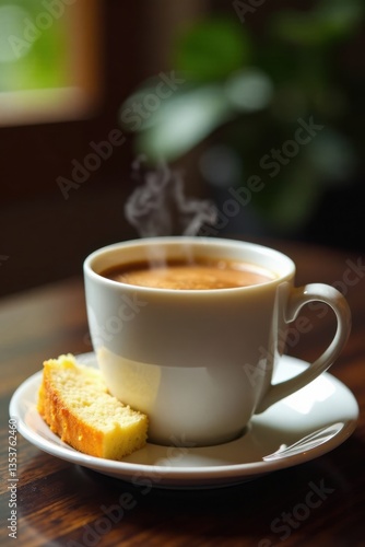 A slice of vanilla cake resting in the bottom of a mug filled with steaming hot coffee, milk, mug