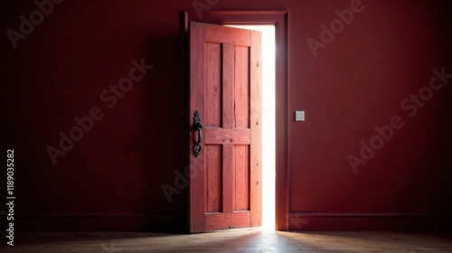 A slightly ajar crimson door reveals a bright light, inviting exploration of an unknown space beyond