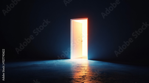 A slightly open white door in a dark room, with light shining through, a minimalistic black background
