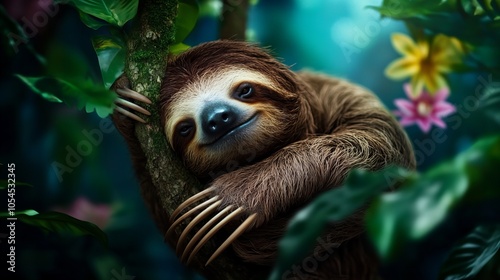 A sloth hangs from a tree branch with a relaxed and happy expression, surrounded by lush greenery.