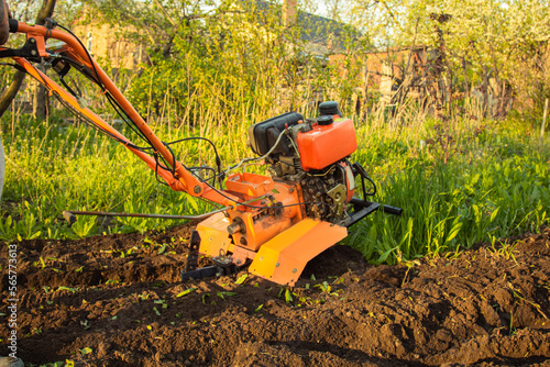 a small agricultural tractor plows the ground, the work of a walk-behind tractor. land treatment for planting.