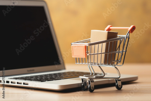 a small basket for groceries on the background of a laptop. generative ai