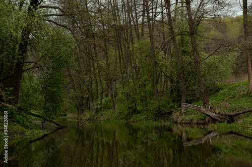 A small beautiful river among trees with quiet creeks in the spring.