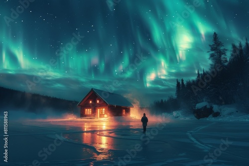 A small beautiful wooden house in northern Canada near a frozen lake, with the stunning northern lights shimmering above.