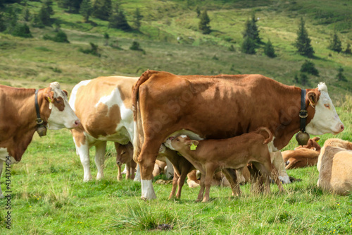 A small brown calf drinking milk from its mother on the pasture in Austrian Alps. There are other cows grazing on the meadow in the back. Natural habitat of domestic animals. Serenity and calmness