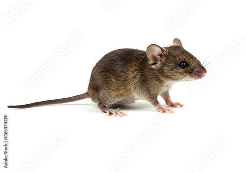 A small brown mouse with a long tail standing on a white surface in a studio environment looking right