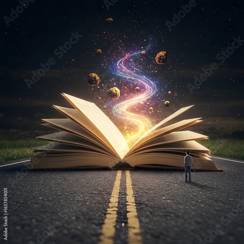 A small figure embarks on a journey of discovery, standing before a giant open book on a road that unleashes a cosmic stream of imagination and knowledge.