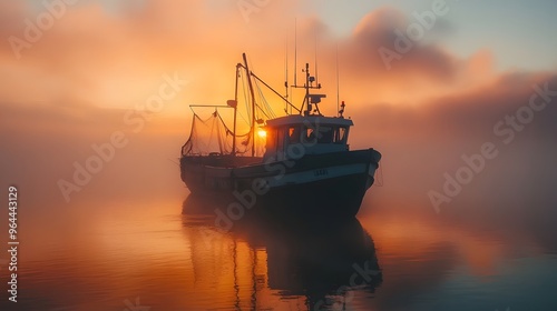 A small fishing boat on still waters at dawn, with mist rising from the surface and soft light casting a peaceful glow over the scene. Nets and fishing gear are visible on deck.