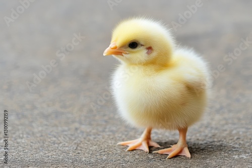 A small, fluffy yellow chick standing upright, showcasing its soft feathers and curious expression.