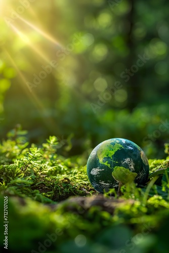A small green globe in a forest with plants and mosses. Glass globe representing Earth in sunlight. Earth day and environment visual concept.