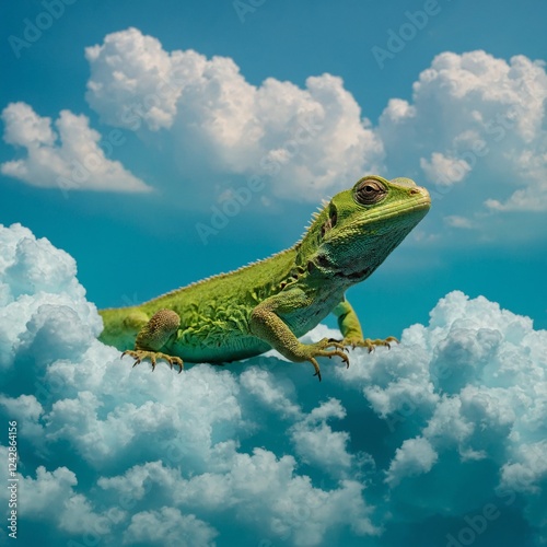 A small green lizard on a turquoise blue backdrop with soft clouds.