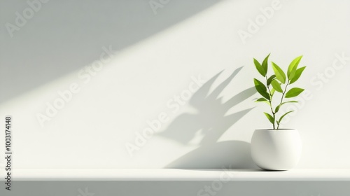 A small green plant flourishes in a sleek pot casting playful shadows on the wall