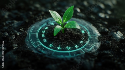 A small green plant sprouting from soil, surrounded by a glowing circular interface.