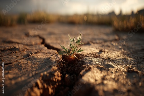 A small green sprout emerges from the cracked dry earth in a barren landscape, symbolizing hope, resilience and the enduring power of nature against adversity under warm sunlight.