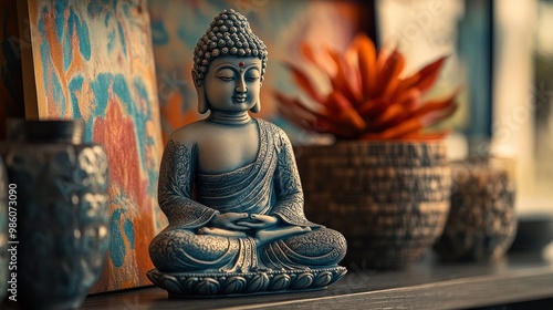 A small, hand-painted Buddha figurine displayed on a shelf with a backdrop of vibrant, colorful artwork. The figurine’s intricate details are highlighted by the soft, diffused light, and the
