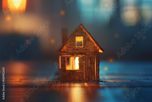 A small house with a bright roof and windows lit up