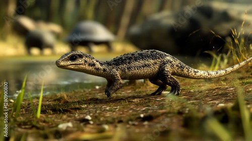 A small lizarid, scaly creature with a long tail and short legs walking through the grass in its natural habitat