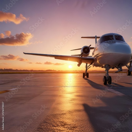 A small plane is parked on a runway at sunset, with a single piece of luggage next to it in the foreground, nature, empty space