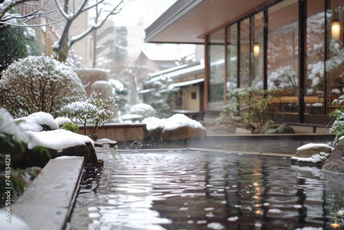 A small pond sits in the center of a snow-covered yard, surrounded by white flakes and bare trees