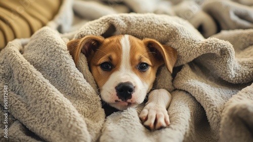 A small puppy cuddled up in a cozy blanket, with its ears perked up and a content expression, highlighting its cuteness and comfort.