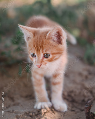 A small red kitten with big blue eyes. A kitten walks on the grass in the Park. Kitten in nature. Baby, boy cat.