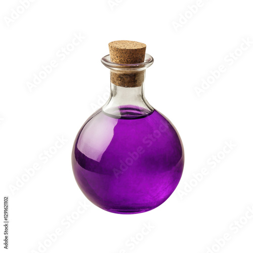 A small round glass bottle with a cork stopper filled with a bright purple liquid, isolated on a transparent background