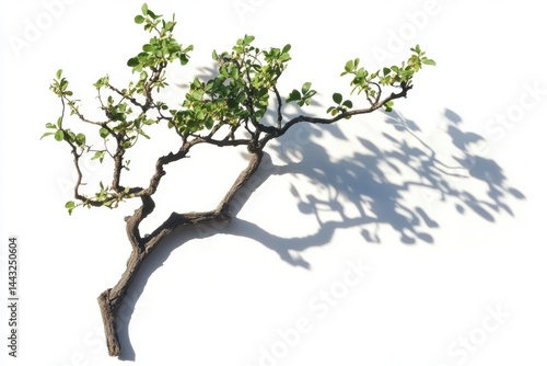 A small tree branch with green leaves casting a shadow on a white surface in bright sunlight