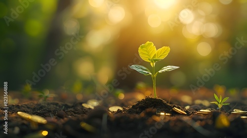 A small tree growing from the ground, surrounded in the style of gold coins and green leaves. This scene symbolizes growth in business or financial support.