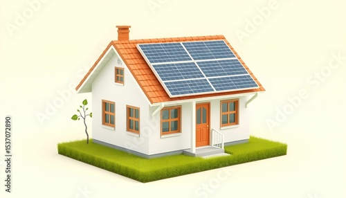 A small, white house with solar panels on its roof, sits on a patch of grass against a pale yellow background.