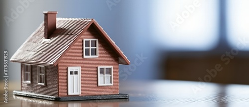 A small wooden house model sits on a table, showcasing fine details and a cozy design, illuminated by soft natural light.