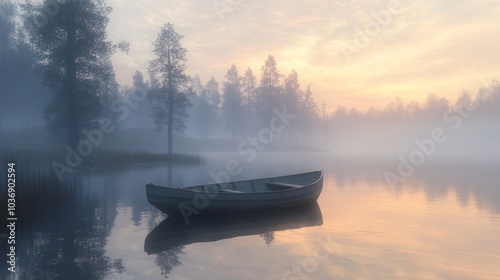 A small wooden rowboat floating peacefully on a misty lake at dawn, with tall trees lining the shore and fog hanging low over the water.