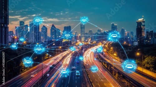 A smart city at dusk, with advanced infrastructure, autonomous vehicles, and brightly lit buildings, showcasing the integration of technology into urban living and the future of smart cities