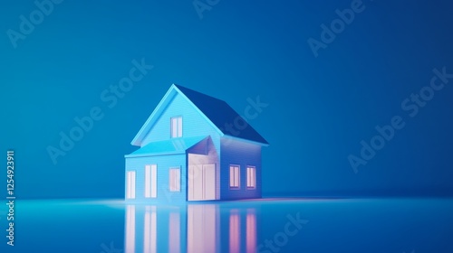 A smart house hologram on a blue background symbolizes AI and virtual assistant technology.