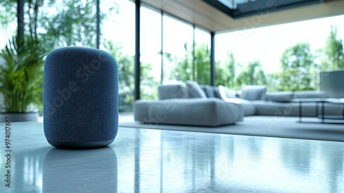 A smart speaker on a table in a modern living room with large windows and greenery outside.