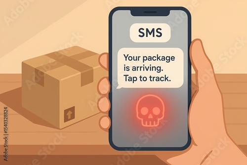 A smartphone shows a fake delivery tracking SMS with a red skull icon, representing a smishing scam. A cardboard package is in the background. Flat editorial vector style.
