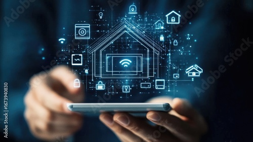 A smartphone user interacts with a digital interface showcasing smart home technology, highlighting connectivity and convenience in modern living spaces through innovative applicat