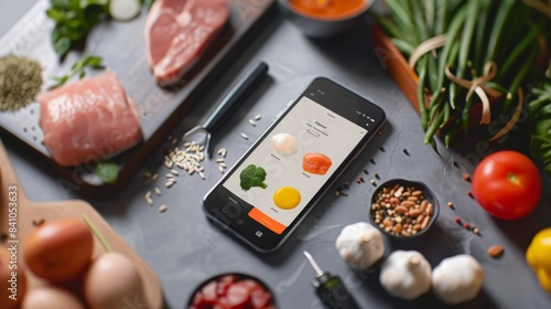 A smartphone with a bright screen displaying a selection of food options lies on a grey surface surrounded by raw ingredients, including meat, broccoli, garlic, and tomato.
