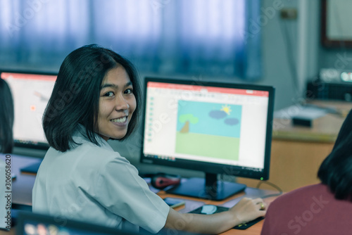 A smiling Asian female high school student in white uniform is learning in computer room.