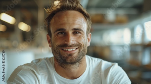 A smiling businessman appears to be daydreaming in an industrial setting, captured in a close-up, showcasing a joyful expression.