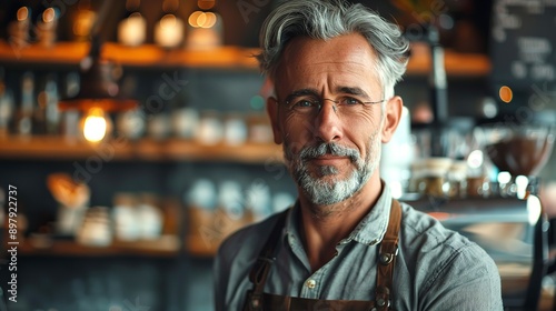 A smiling chef stands in a kitchen with apron on and apron around his arm