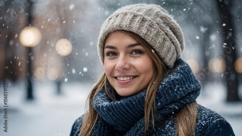A smiling girl standing in the snow, with snowflakes gently falling around her, capturing the essence of a joyful winter atmosphere