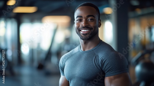 A smiling man in a vibrant workout outfit stands confidently in a brightly lit gym, surrounded by modern fitness equipment