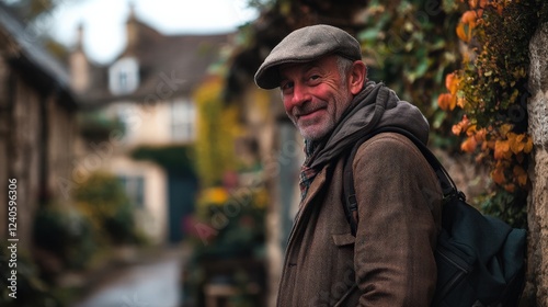 A Smiling Man Stands in a Beautiful Laneside Village in Autumn